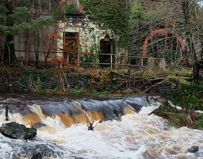This small gallery of recently taken photographs shows the little thatched mill tucked away in the shadow of a much later and larger beetling mill which, as you can see, has suffered severely from vandalism.